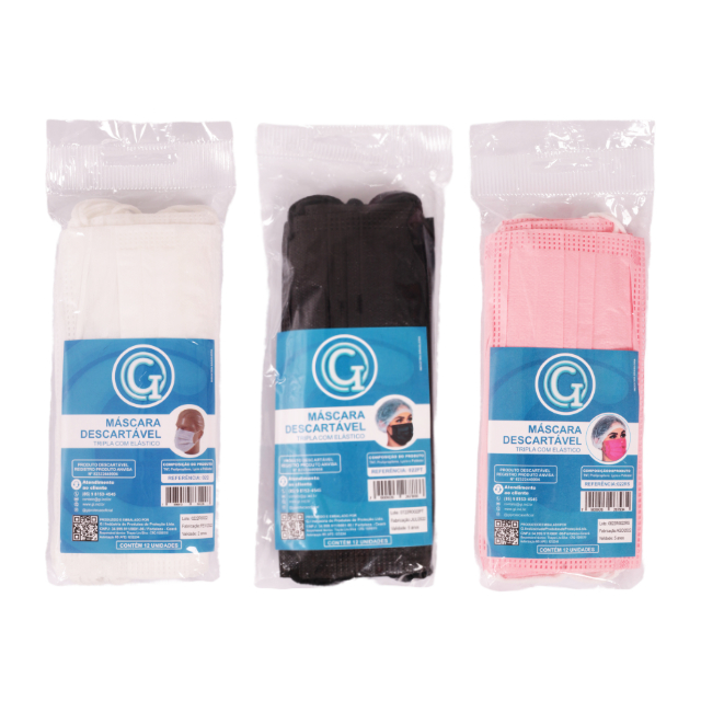 MÁSCARA TRIPLA C/ ELÁSTICO BRANCA, ROSA E PRETA 12uni e 50uni